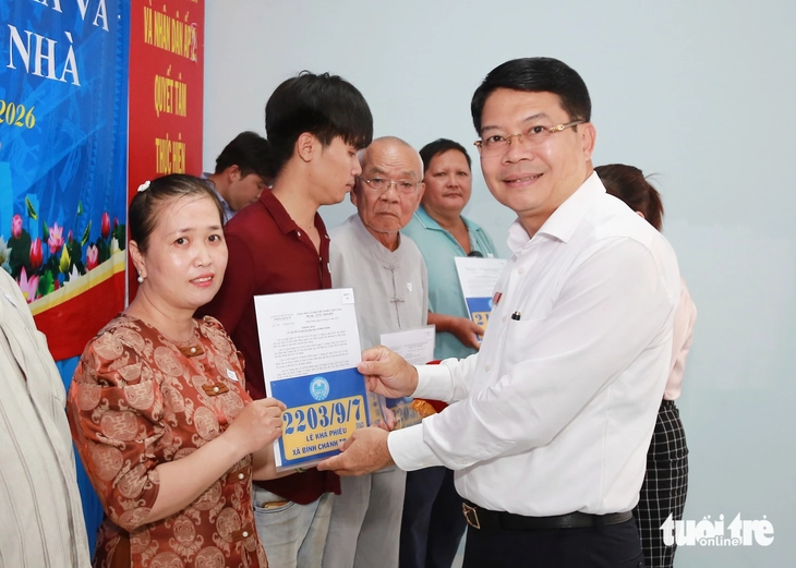 Ông Nguyễn Thành Lợi - Bí thư Đảng ủy, Chủ tịch HĐND xã Bình Chánh - trao thông báo số nhà và bảng số nhà cho hộ dân vào chiều 10-3 - Ảnh: NGỌC KHẢI