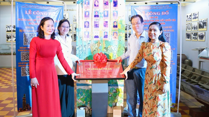 Lãnh đạo xã Hóc Môn thực hiện nghi thức công bố mã QR tại Di tích lịch sử văn hóa cấp quốc gia Dinh Quận Hóc Môn (số 1 Lý Nam Đế, xã Hóc Môn, TP.HCM) - Ảnh: NGỌC THUẬN
