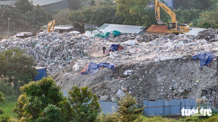 Hiện trạng bãi chứa rác thải xây dựng cạnh cụm công nghiệp Lại Yên (xã Sơn Đồng) với nhiều loại rác chất thành đống cao thời điểm tháng 10 - Ảnh: QUANG THẾ