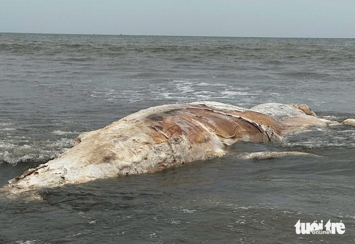 Xác cá voi đang phân hủy dạt vào bờ biển xã Hải Châu, Nghệ An trưa 20-3 - Ảnh: DOÃN HÒA