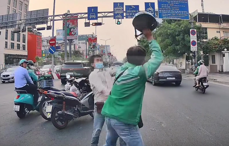 Bất ngờ người đàn ông mặc đồ xe ôm công nghệ tháo mũ bảo hiểm lao vào đánh người đàn ông đi xe máy. Người bị đánh cũng lập tức tháo mũ bảo hiểm đáp trả.