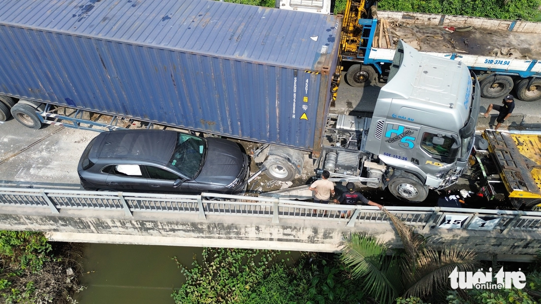Ô tô bị xe đầu kéo ép "dính chặt" vào lan can cầu Kênh Một Tấn - Ảnh: MINH HÒA