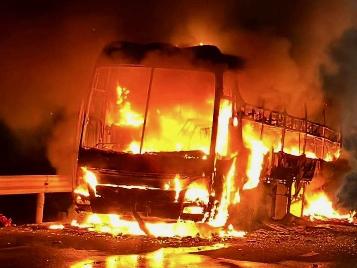 Riêng xe khách bốc cháy dữ dội, lan rộng ra toàn bộ xe và cháy rụi chỉ còn trơ khung. Thiệt hại ban đầu ước tính khoảng 3 tỉ đồng.