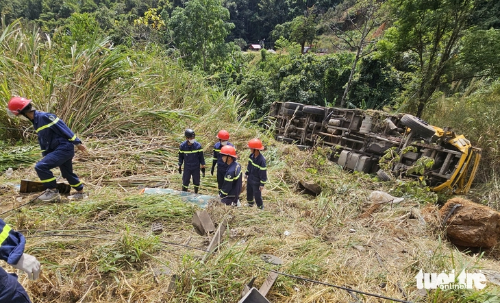 Tại hiện trường, chiếc xe bị cây rừng cản lại, nằm lưng chừng ta luy âm khoảng 5m. Cabin vỡ nát, khung xe biến dạng, hư hỏng nặng.