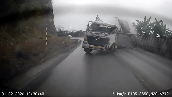 Chưa dừng lại, chiếc xe tải tiếp tục lao nhanh qua ba ô tô khác trước khi đâm mạnh vào hộ lan ta luy âm rồi lao sang đường đối diện đâm vào vách núi, lật nghiêng.