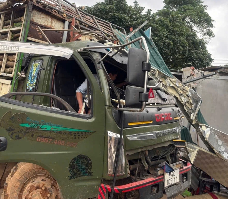 Chiếc xe tải bị hư hỏng phần đầu sau khi va chạm với xe máy và lao vào nhà dân - Ảnh: T.G.