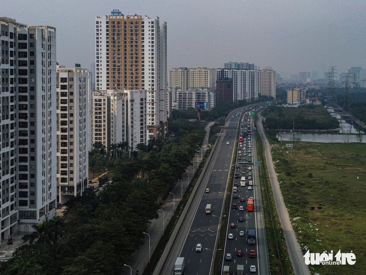 Trên đường vành đai 3, lượng xe đông nhưng chỉ xảy ra ùn nhẹ tại các nút giao. Lực lượng chức năng trước đó đã có phương án tạm cấm xe trọng tải lớn đi vào tuyến này