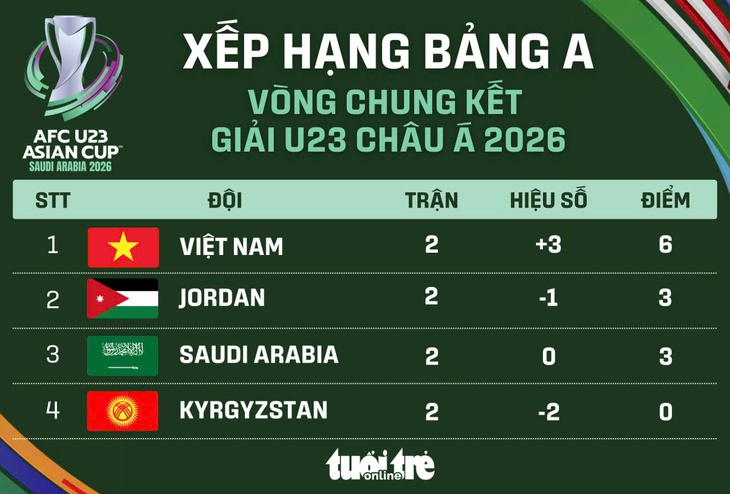 Với kết quả này, U23 Việt Nam tạm dẫn đầu bảng với 6 điểm, hiệu số 3. U23 Jordan và Saudi Arabia có cùng 3 điểm, lần lượt chia nhau hai vị trí tiếp theo.