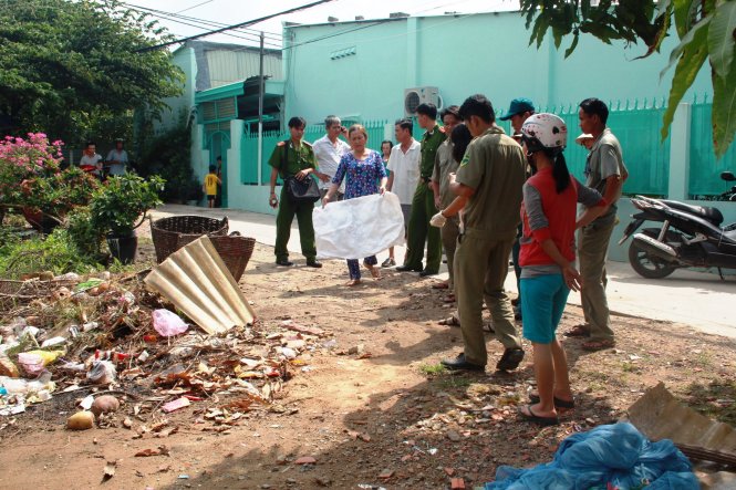 Theo người dân khu vực, khoảng 7g30 sáng cùng ngày, một thanh niên tên Thành (khoảng 30 tuổi) đến gom rác thì phát hiện túi nilông màu xanh dính đầy máu bỏ trong sọt rác.