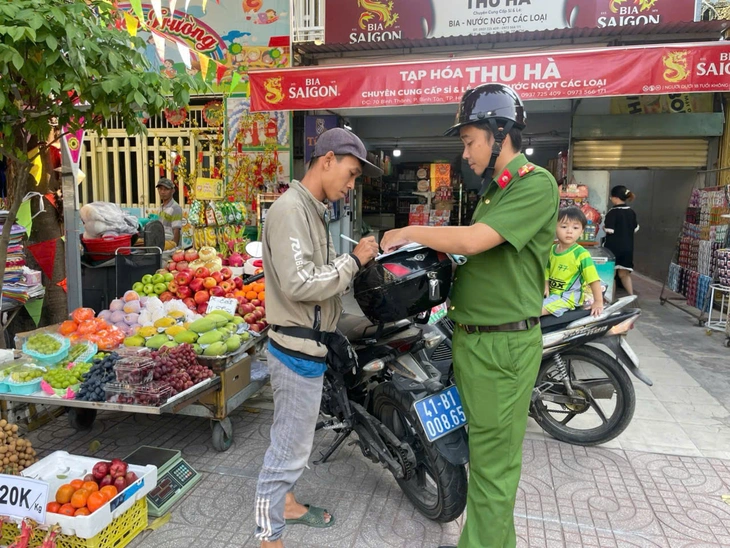 Đội cảnh sát giao thông An Lạc phối hợp Công an phường Bình Tân xử lý tình trạng lấn chiếm vỉa hè - Ảnh: PC08