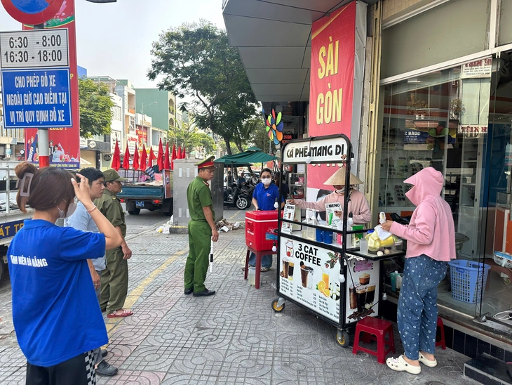 10h trưa, dù giữa nắng nóng gay gắt nhưng lực lượng công an, trật tự đô thị, bảo vệ an ninh cơ sở của phường Thanh Khê (TP Đà Nẵng) vẫn có mặt trên trục Trần Cao Vân để xử lý lấn chiếm vỉa hè.